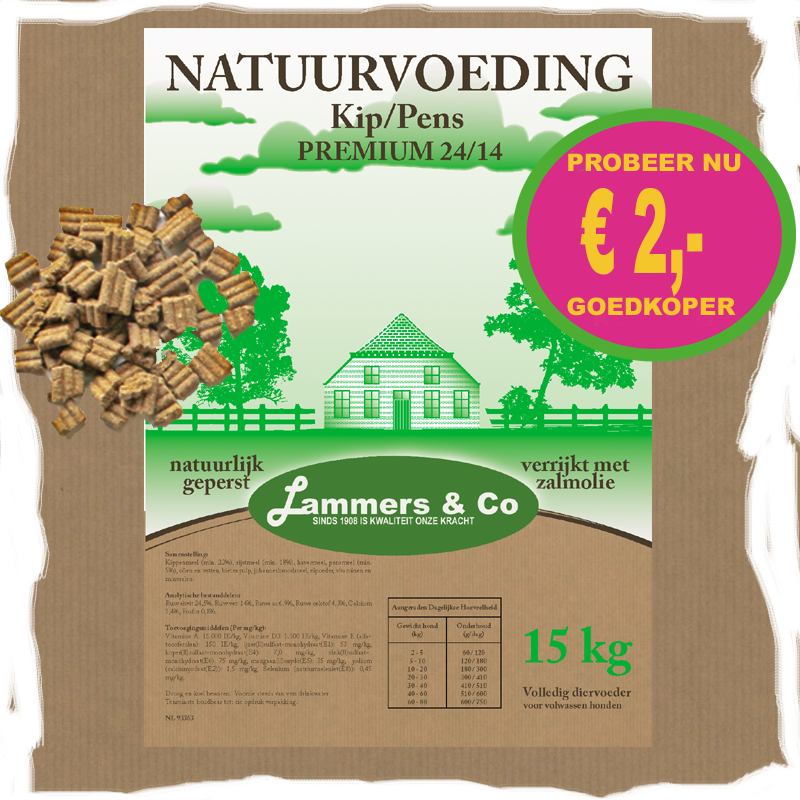 Kip/Pens is een smaakvolle geperste brok met een gangbare 24% eiwit / 14% vet.