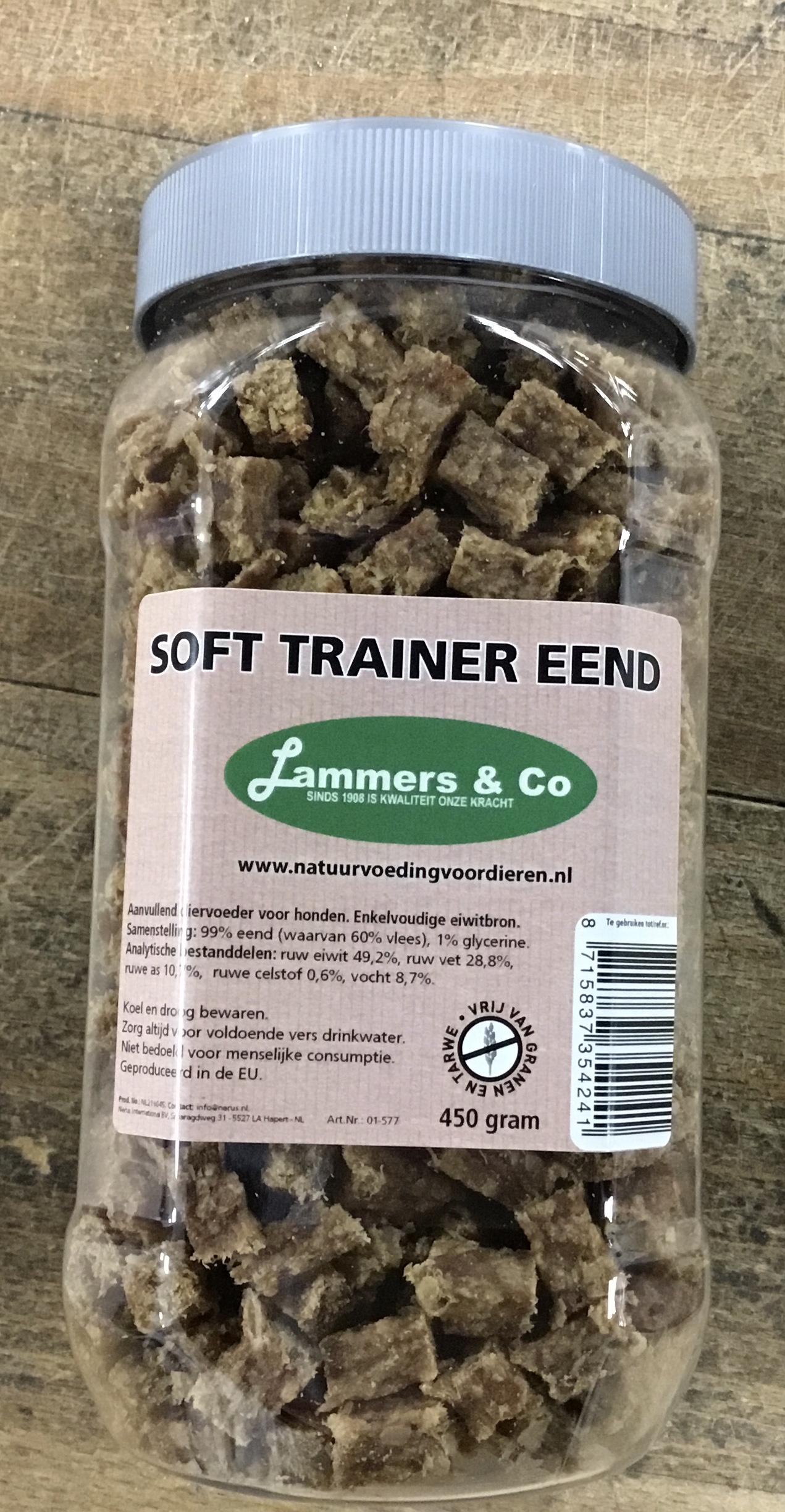 100% natuurlijk. 99% eend, 1% glycerine. Graanvrij.