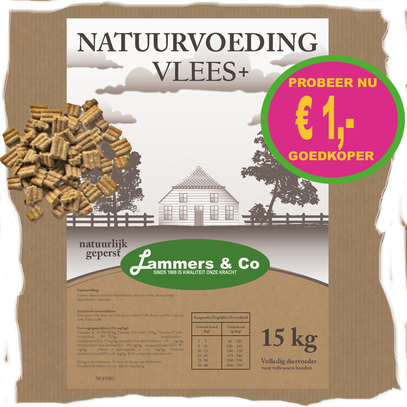 Vlees+ is een simpele geperste brok met 29% eiwit / 7% vet.